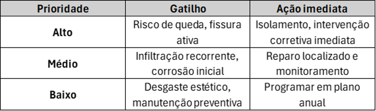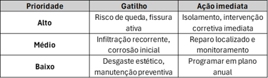 Integre inspeções periódicas e monitoramento (fissurômetros, termografia) para itens críticos.